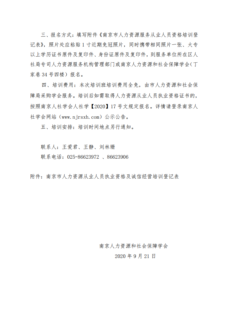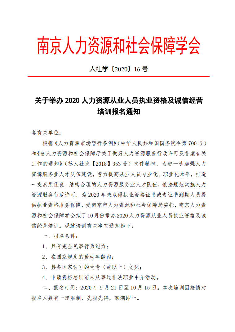 人社学【2020】16号文 关于举办2020人力资源从业人员执业资格及诚信经营培训的通知