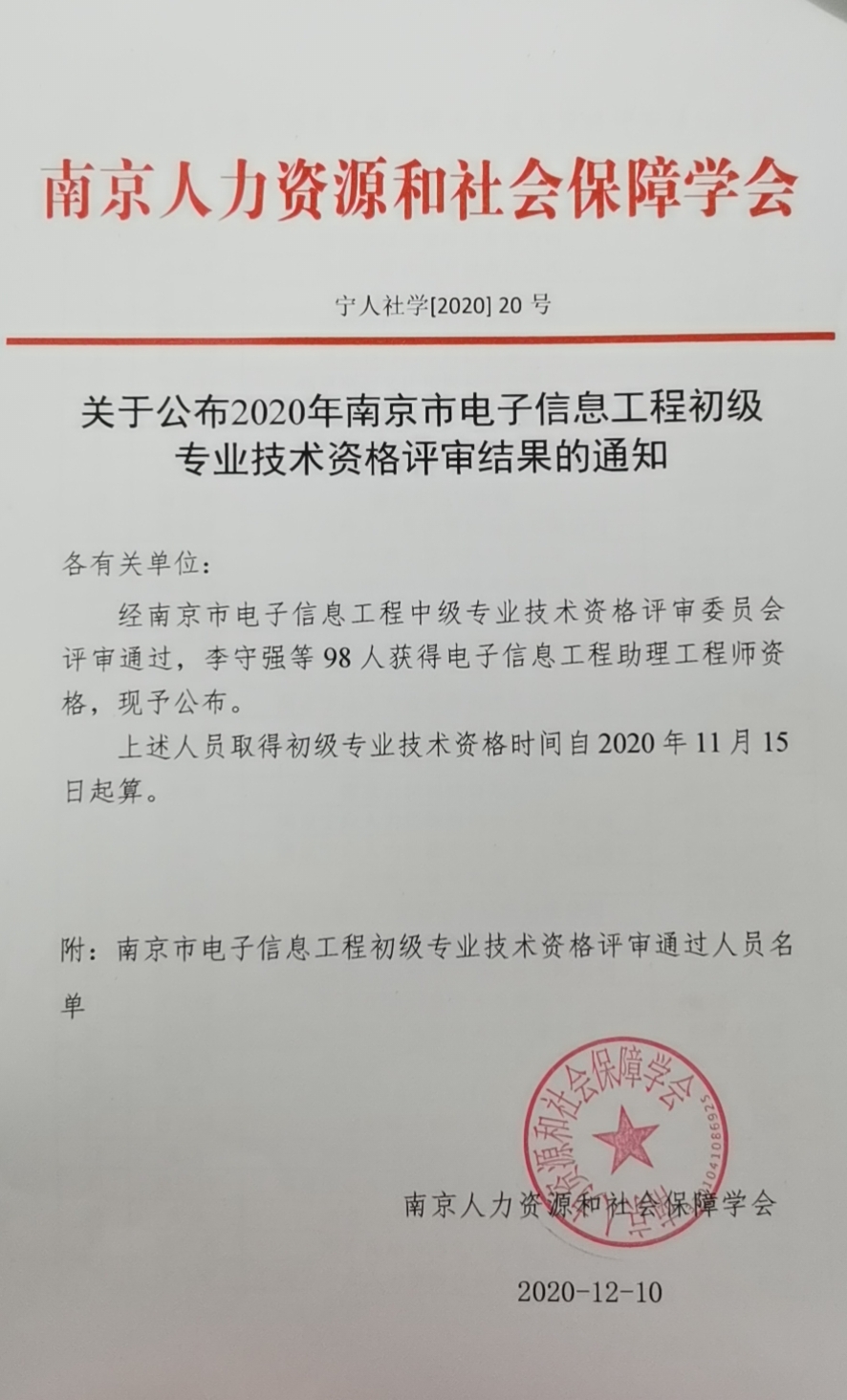 关于公布2020年南京市电子信息工程初级专业技术资格评审结果的通知
