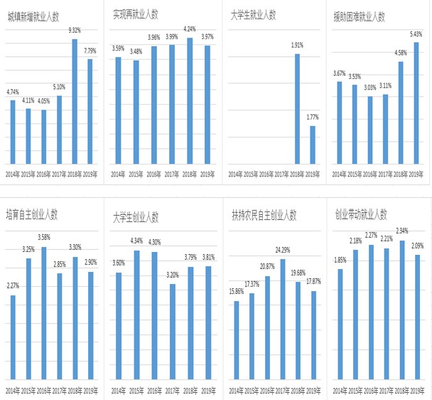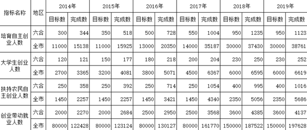 4、创业带动就业人数(人)是指报告期内,六合辖区内自主创业者创办的经济实体中,建立劳动关系、实现就业的人数。
