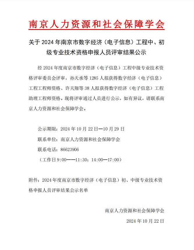 关于2024年南京市数字经济(电子信息)工程中、初级专业技术资格申报人员评审结果公示