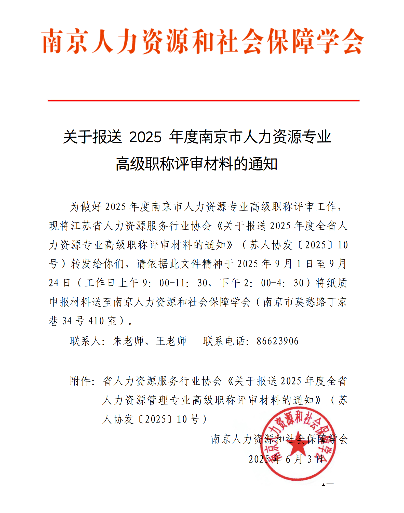 关于报送2025年度南京市人力资源管理专业高级职称评审材料的通知